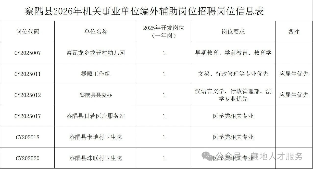 附件:1.察隅县2026年机关事业单位编外辅助岗位招聘岗位信息表