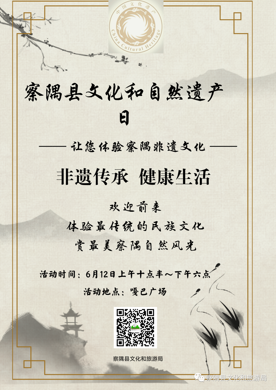 历史的长河中,非遗璀璨的文化至今熠熠生辉。品千年文化,留万世遗产,2020年6月12日,在察隅县嘎巴广场举行“文化和自然遗产日”,让您体验最传统的民族非遗文化和察隅最美的自然风光。